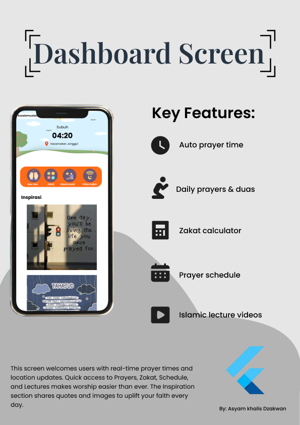 Dashboard Screen This screen welcomes users with real-time prayer times and location updates.Quick access to Prayers, Zakat, Schedule, and Lectures makes wo ...