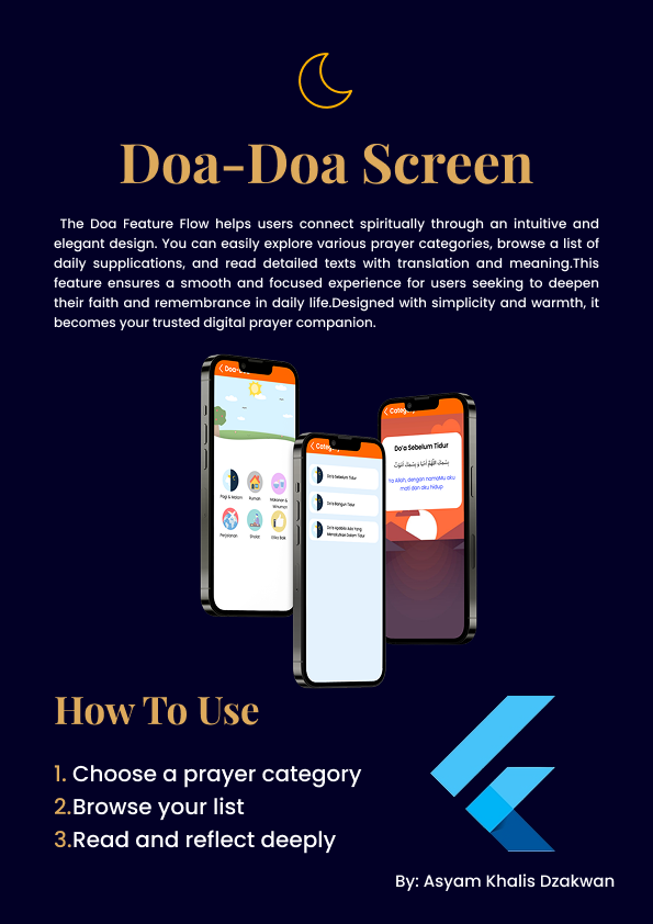 Doa-Doa Screen The Doa Feature Flow helps users connect spiritually through an intuitive and elegant design.You can easily explore various prayer categories ...